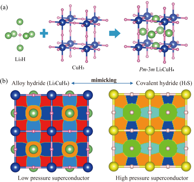(a) Li3CuH4的结构设计示意图,(b) Li3CuH4H3S中Bader电荷边界的相似性。