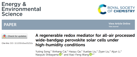 近日,吉林大学物理学院新型电池物理与技术教育部重点实验室王晓峰教授团队宽带隙钙钛矿太阳能电池研究方面取得重要进展,相关成果以“A regenerable redox mediator for all-air processed wide-bandgap perovskite solar cells under high-humidity conditions”为题发表在国际权威期刊《Energy & Environmental Science》上。