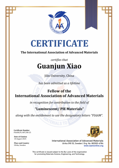近日,在瑞典斯德哥尔摩召开的第65届国际先进材料大会上,吉林大学物理学院高压与超硬材料全国重点实验室肖冠军教授当选国际先进材料学会会士(Fellow of International Association of Advanced Materials, FIAAM),以表彰其在压力诱导发光材料研究的前沿探索与原创贡献,并应邀于国际先进材料学会会士峰会(IAAM Fellow Summit)上做特邀报告。