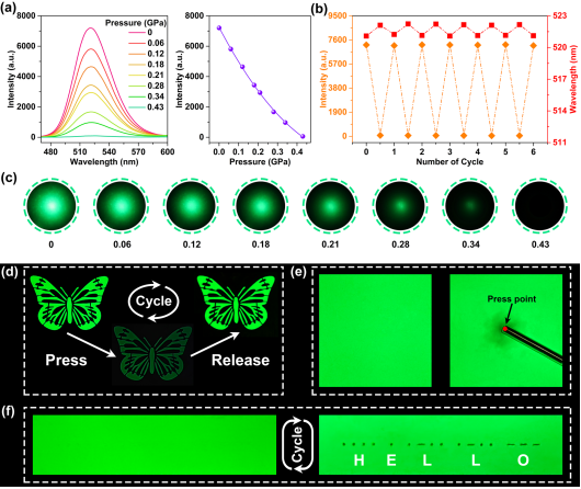 具有快速响应能力的智能材料是当前技术创新的新质生产力。其中,压力响应材料因具备响应快、控制精度高和能耗低等优势而备受关注。与静态压力响应材料相比,动态压力响应材料稳定性较差且研究成本较高,极大制约了其在工业监测中的广泛应用。前期研究中,课题组在Cs4PbBr6钙钛矿纳米晶中首次实现了压强诱导发光(PIE)(Nat. Commun. 2018, 9, 4506),并不断拓展了系列压力诱导发光材料;通过构筑空间位阻等提高相变势垒,截获高压亚稳相,进而将高效发光高压相稳定至常压存在,极大地促进压强诱导发光从基础研究迈向实际应用。与此同时,往往忽略了快速压力猝灭亦可应用于压力灵敏开关。