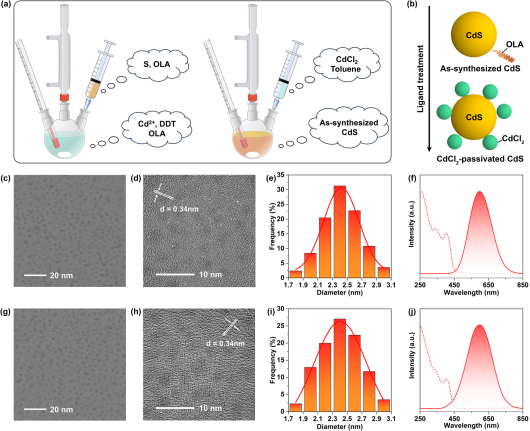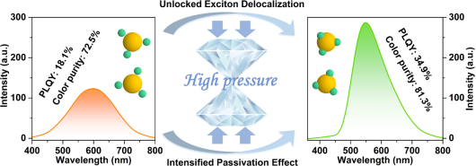 近日,吉林大学物理学院高压与超硬材料全国重点实验室肖冠军教授等人在传统CdS量子点表面缺陷态的压力调控研究中取得重要进展。研究团队通过选择结合力更强、配位位点更丰富的原子配体CdCl2,成功合成新型包覆结构的CdS量子点。高压处理进一步强化了量子点与配体之间的相互作用,有效修饰了其表面态,促使激子向量子点表面离域扩展。压力有效优化了CdS–CdCl2界面,促进激子离域与表面钝化效应,从而显著提升了发光性能。该研究为拓展量子点材料在光电子学领域的应用提供了新颖的设计思路与理论依据。相关研究成果以“Enhanced Excitons Delocalization Toward High-Quality Emission Harvesting Unlocked by Pressure and Ligand Engineering”为题发表在《Nano Letters》上。