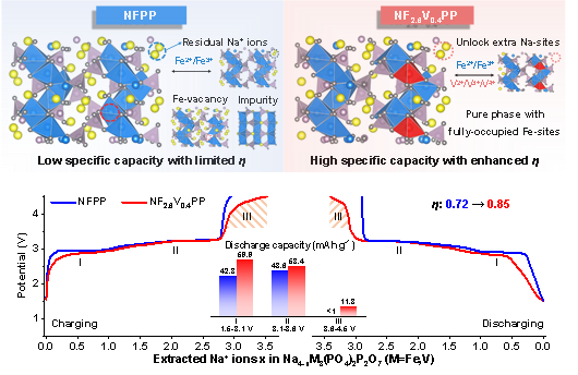 杂化磷酸盐正极Na4Fe3(PO4)2P2O7 (NFPP) 因其坚固的三维框架而成为钠离子电池正极的热门候选材料。然而NFPP的比容量较低,限制了其能量密度的发挥。这一问题主要源于合成过程中产生的非活性NaFePO4杂相,此前大量研究致力于通过引入Fe空位或非活性元素掺杂等策略来消除杂相,然而这也同时导致了过渡金属位点的可用氧化还原电对数量降低,因此仍难以充分激发NFPP的容量。此外,关于NFPP中空位诱导杂相形成的内在机制仍不明确,深入理解该机制对于推动NFPP的工业化生产至关重要。