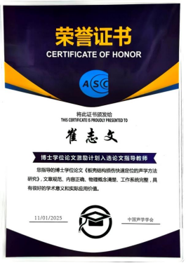 2025年11月1日,中国声学学会在2025年中国声学大会开幕式颁奖阶段举行了“博士学位论文激励计划”发布仪式。为推动我国声学领域科研创新与高层次人才培养,提升博士研究生培养质量,中国声学学会于近期组织开展了2021年至2024年度声学及相关领域博士学位论文评选工作。经过严格的资格审查、初评、终评及结果公示等环节,物理学院声学研究团队2024届博士毕业生周子贤的博士学位论文《板壳结构损伤快速定位的声学方法研究》入选2024年度“中国声学学会博士学位论文激励计划”,他的论文指导教师崔志文教授也因在研究生培养工作中的突出成绩,荣获“博士学位论文激励计划指导教师”称号,并在2025年全国声学大会受到表彰。