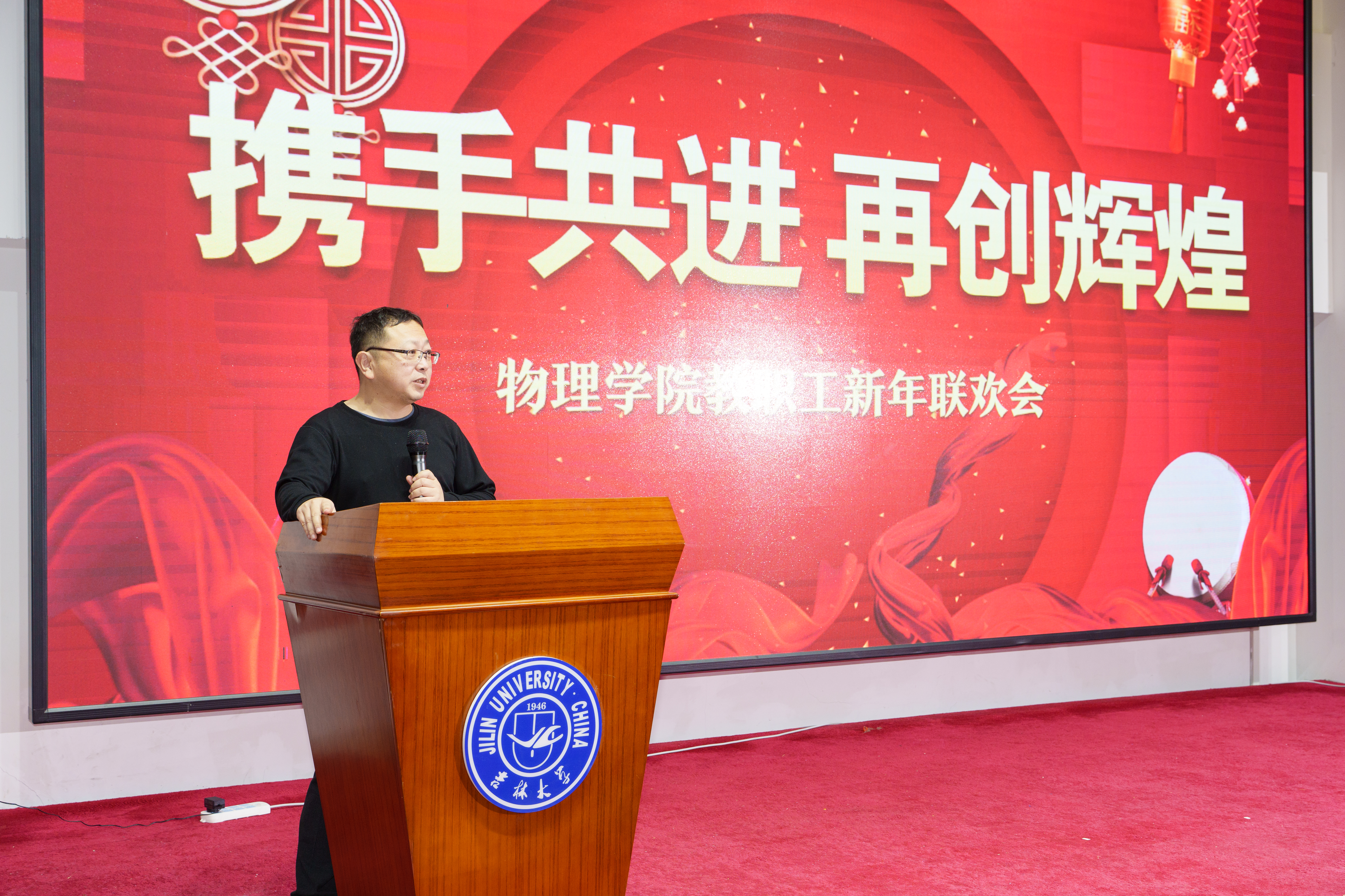 联欢会在院长邹勃热情洋溢的新年致辞中拉开帷幕。邹勃全面回顾了学院2025年在学科建设、人才培养、科研创新等方面取得的扎实成绩。学科平台上,“高压与超硬材料全国重点实验室”成功重组、“综合极端条件实验装置”通过国家验收;人才培养方面,学生在多项重要赛事中表现优异;科研创新持续突破,全年新增项目80余项,到账经费超1.9亿元,室温超导研究刷新世界纪录,高水平论文数量显著增长;人才队伍建设稳步推进,新增国家级青年人才3人,“十四五”期间国家级人才数量实现翻番。邹勃强调,所有成绩源于全体教职工日复一日的坚守与付出,并指出2026年是“十五五”规划开局之年,全院师生应继续锚定目标,传承“坚忍不拔,追求卓越”的吉大物理精神,在高质量发展道路上稳步前行。