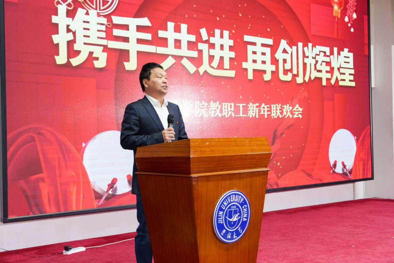 岁末情暖,硕果盈枝;新年肇始,华章待谱。12月31日下午,物理学院教职工新年联欢会在友谊会馆温馨举行。学院全体领导班子成员与150余名教职工欢聚一堂,共迎新春。安徽大地熊新材料股份有限公司常务副总经理、1993级校友陈静武,金黄集团总经理李明,长春启明光电科技有限公司总经理杨胜利,吉林大学科研院科技管理办公室副主任、2000级校友郭庆等嘉宾现场出席。92级校友陈汉栋、93级校友于猛通过云端连线参与,与在场师生温情相聚,共话情谊,同庆新年。