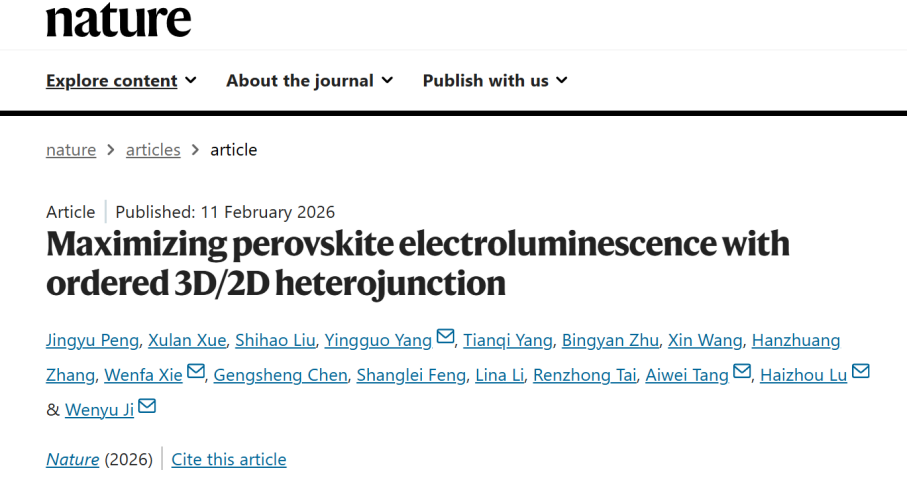 近日,吉林大学物理学院纪文宇、张汉壮教授团队联合电子学院谢文法教授、刘士浩副教授、复旦大学杨迎国教授、东南大学卢海洲教授及北京交通大学唐爱伟教授等研究团队,在钙钛矿电致发光器件(PeLED)发光界面调控及器件效率方面取得突破进展。研究团队通过“一步法”原位构建三维/二维(3D/2D)有序异质结钙钛矿薄膜的新策略,成功将绿光PeLED的外量子效率(EQE)提升至42.9%(经第三方认证为42.3%),刷新了该类器件的世界纪录。相关成果以《Maximizing perovskite electroluminescence with ordered 3D/2D heterojunction》为题发表于国际顶级期刊《Nature》。