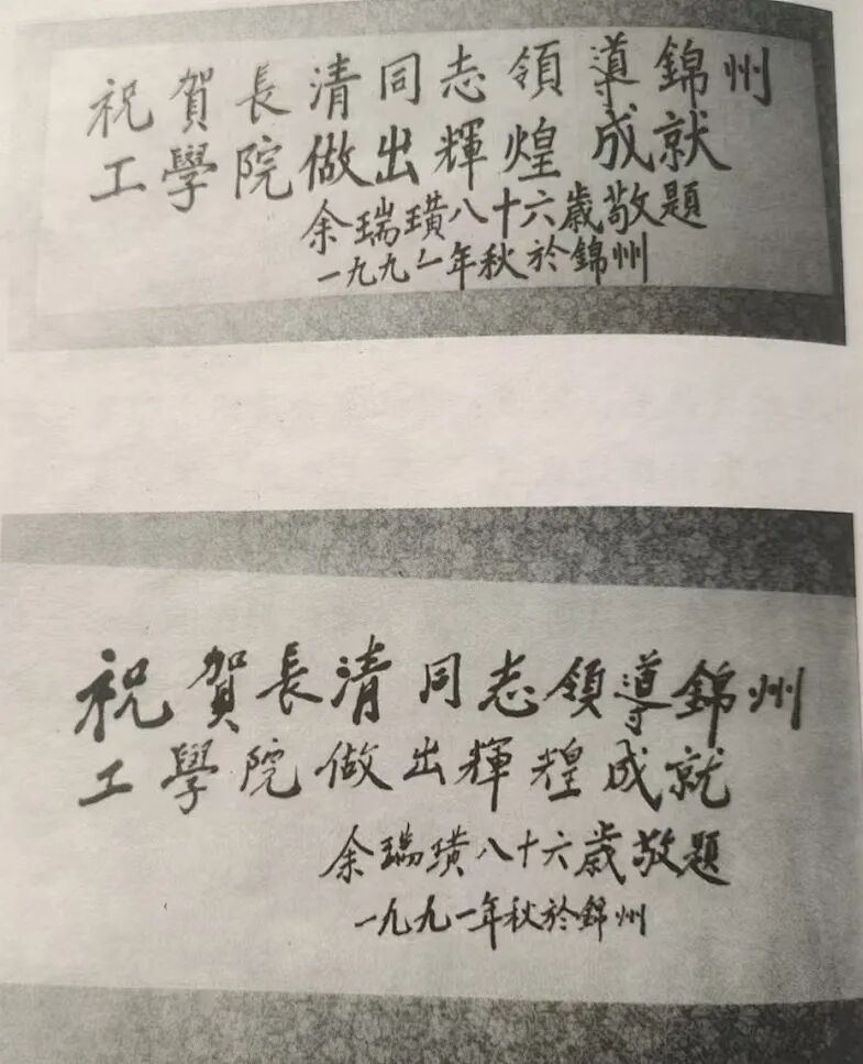 离开锦州前,我请余先生题字留念。他欣然命笔:“祝贺长清同志领导锦州工学院作出辉煌成就”。写完后,不满意,坚持再写一个。我说,不写这个内容,写名人名句,原因我是副院长。这些,当称余先生讲授的第三堂课。