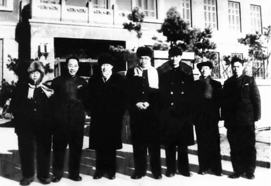 1955年冬,钱学森来校参观物理实验室后在楼前合影